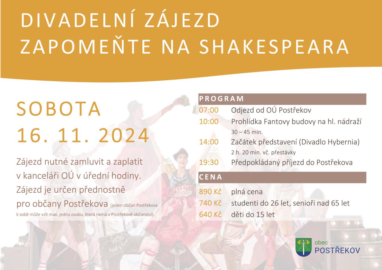 Obec Postřekov Vás srdečně zve na divadelní zájezd do Prahy na hudební komedii Zapomeňte na Shakespeara!. Součástí je i prohlídka Fantovy budovy na hlavním nádraží.