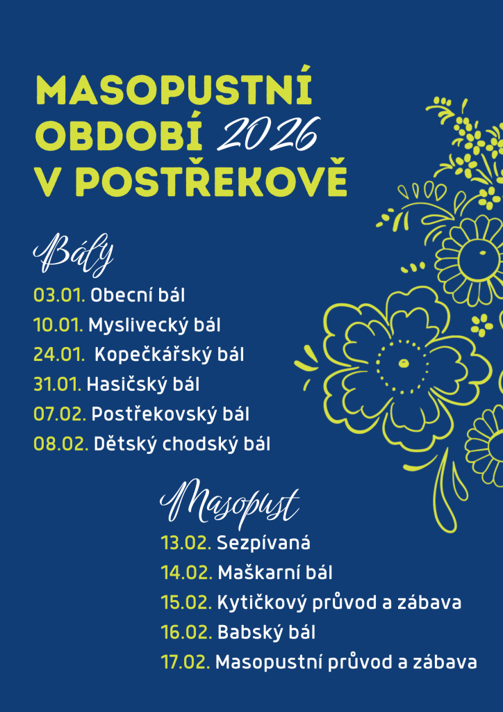 TJ Sokol Postřekov ve spolupráci s Obcí Postřekov, Národopisným souborem Postřekov a SDH Postřekov Vás srdečně zve na tradiční Postřekovský masopust 2026.