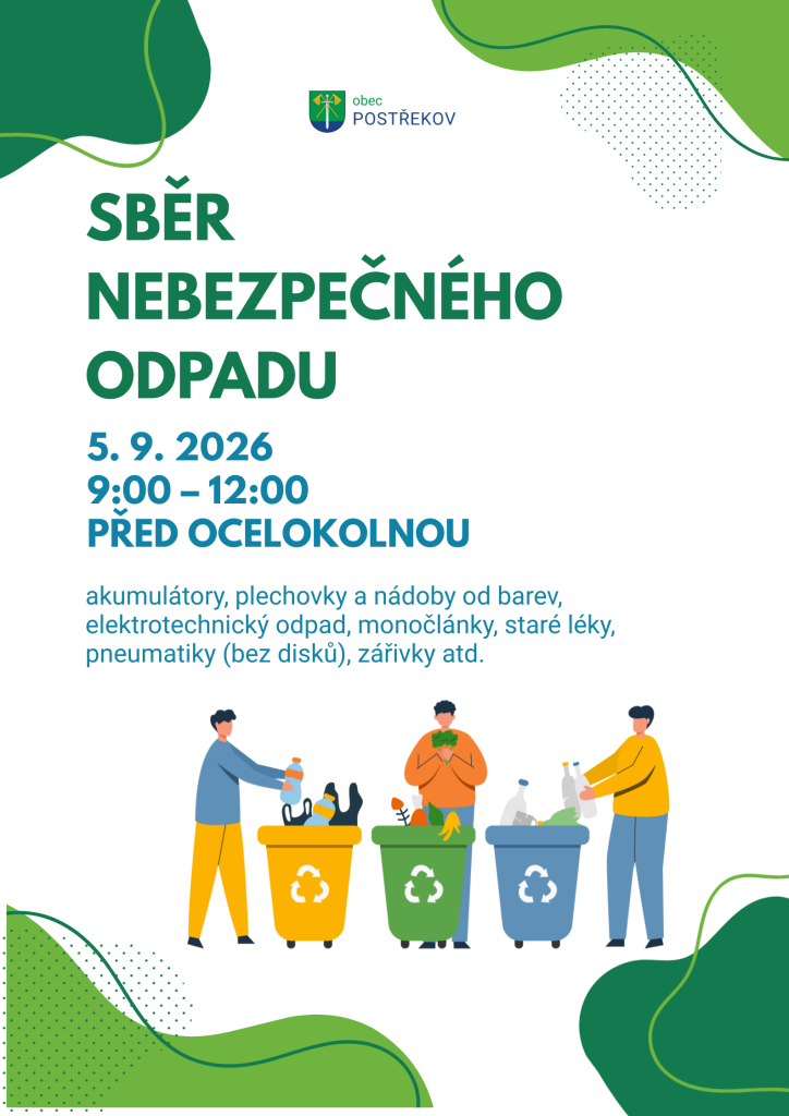 Obec Postřekov pořádá Sběr nebezpečného odpadu v sobotu 5. září 2026 od 9:00 do 12:00 před ocelokolnou.
